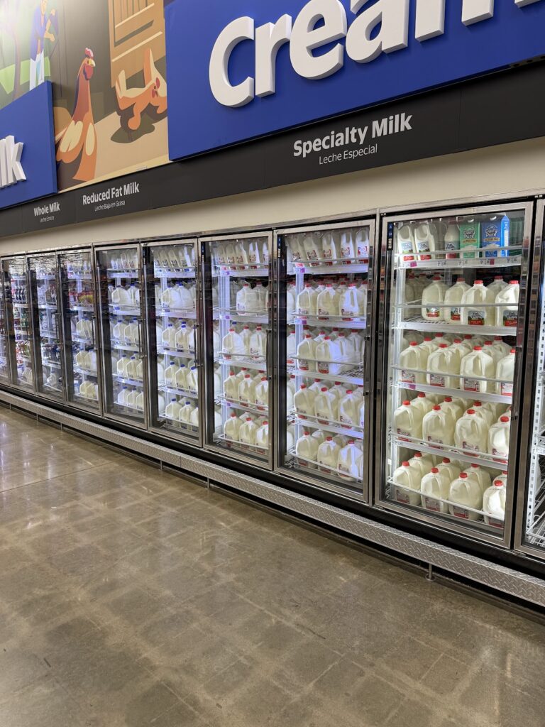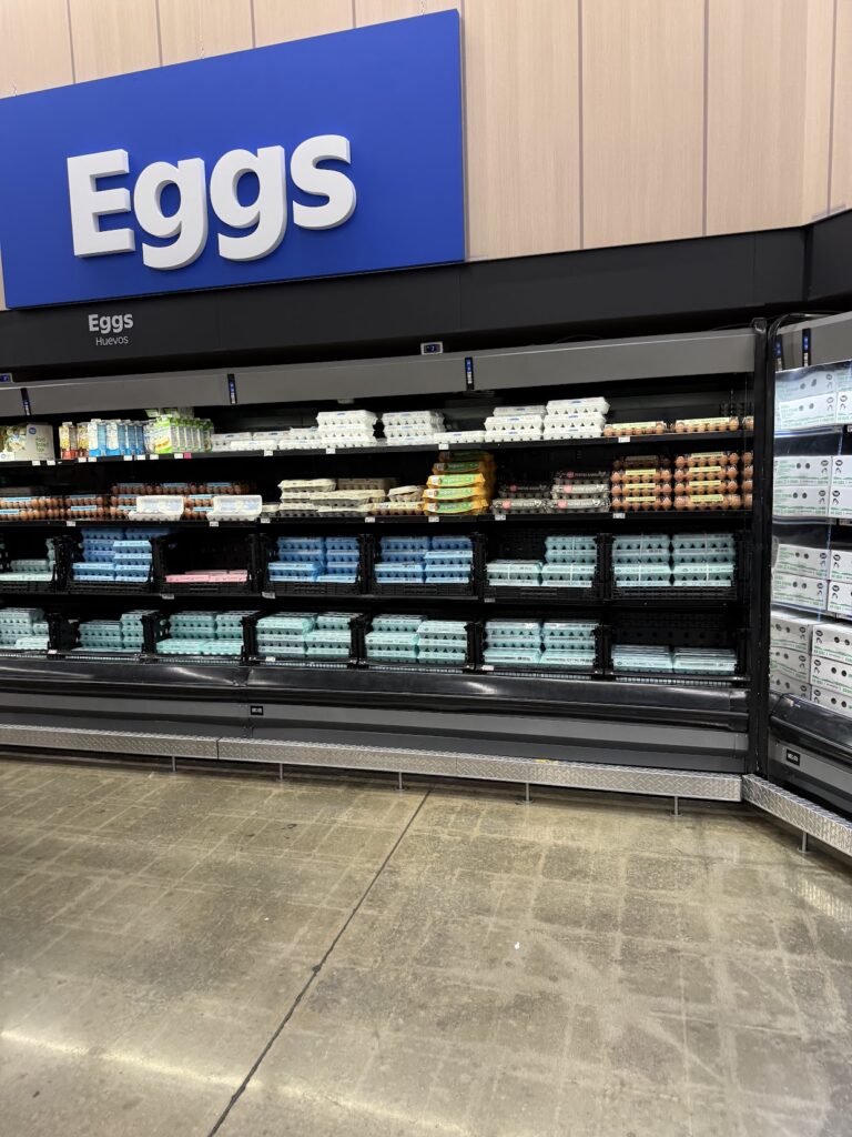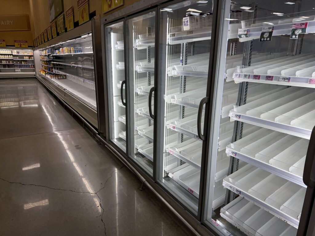 People buy water, toilet paper, eggs, and milk. This morning, there were no milk and eggs in H-E-B, but in Walmart there were both milk and eggs.
