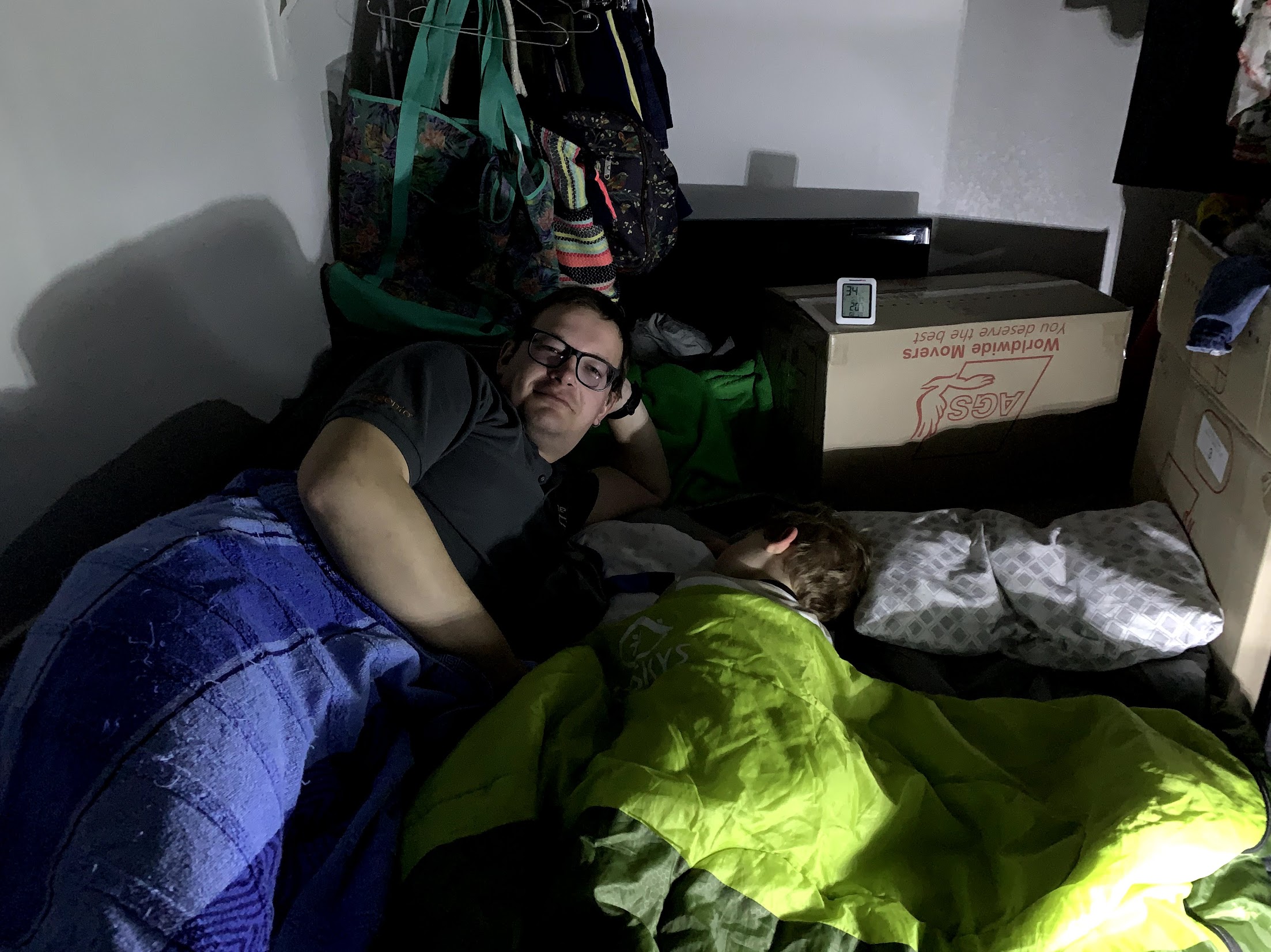 For a couple of nights, we slept in sleeping bags in the master closet. It has no external walls — rooms are all around it. The temperature in the closet stayed around 11–12°C (52–54°F).