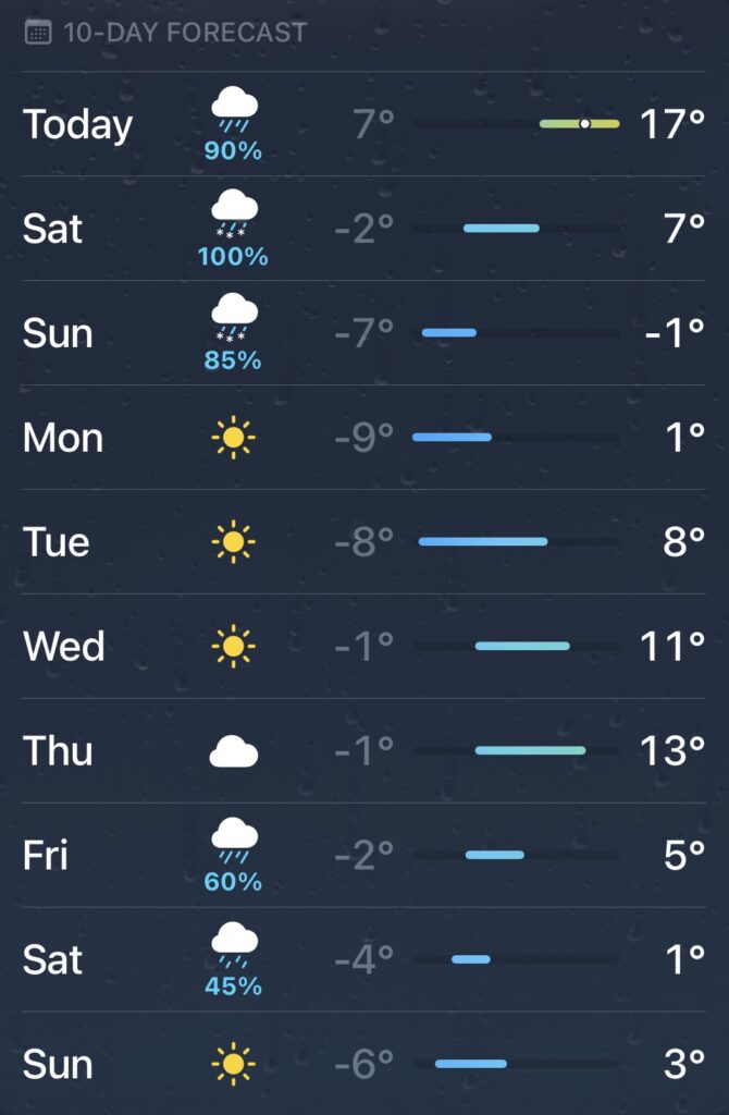 The most “fun” part here is the freeze after the rain. Trees and power lines get covered with ice, which often causes outages and no electricity. Roads also turn icy.